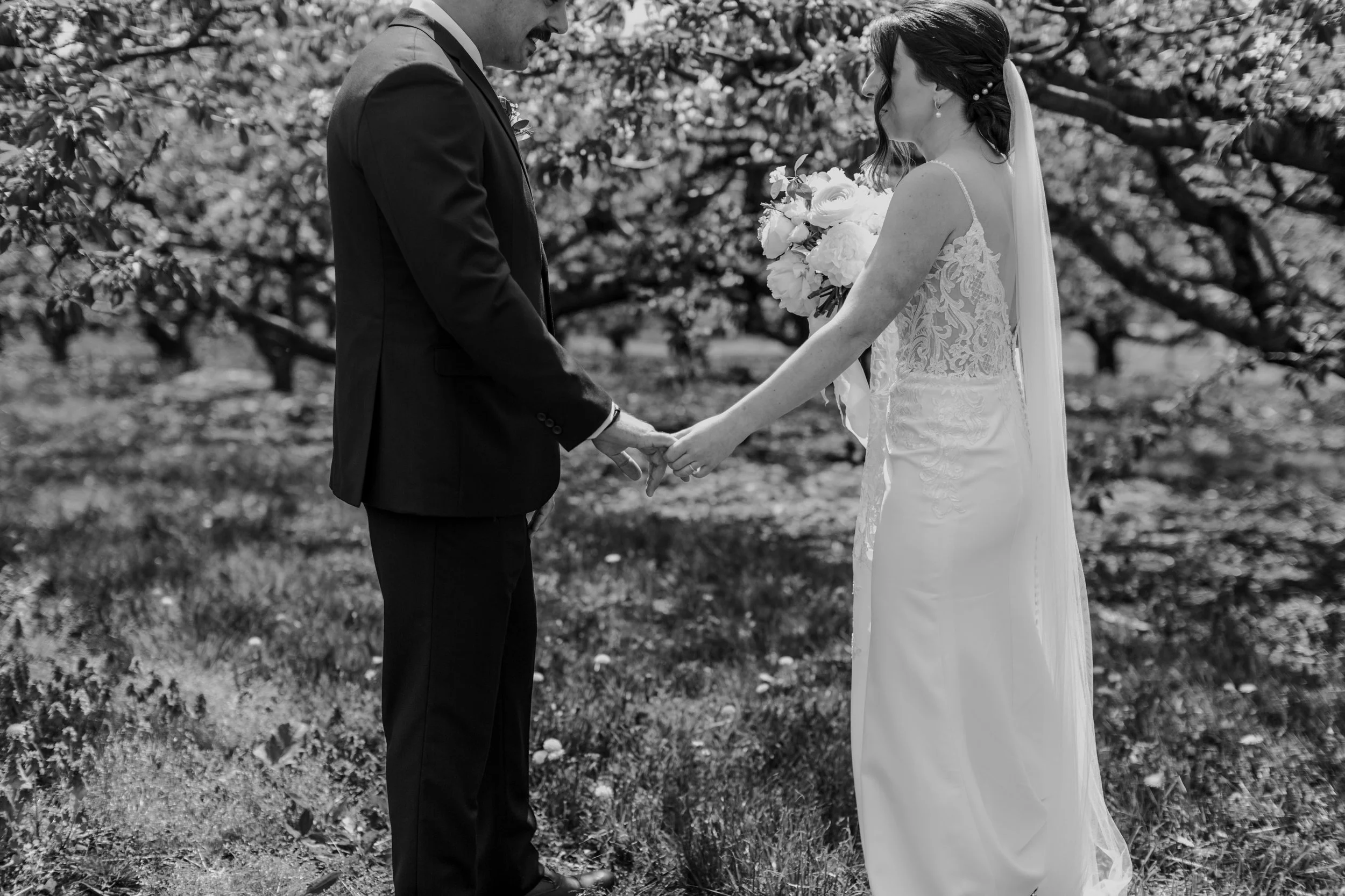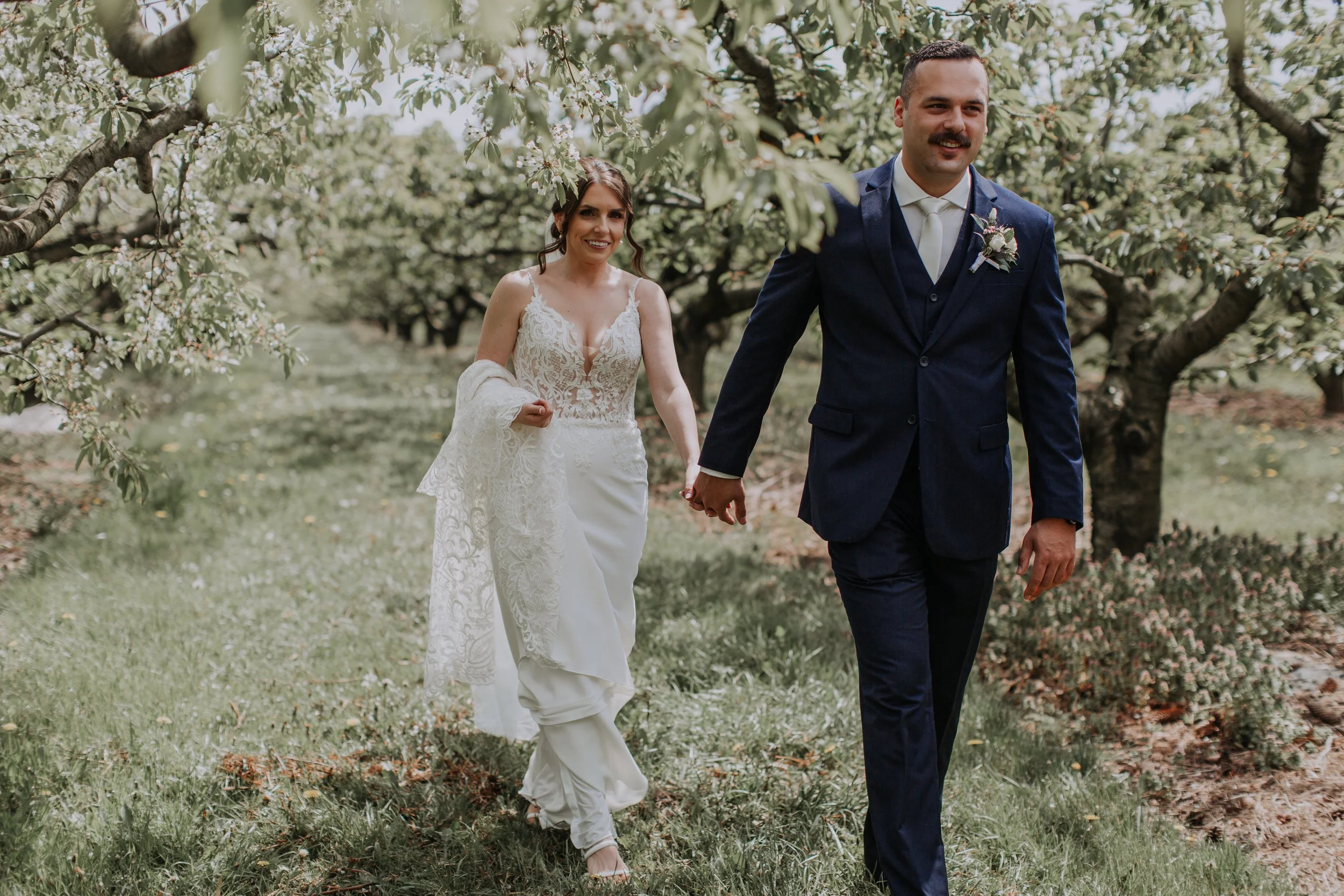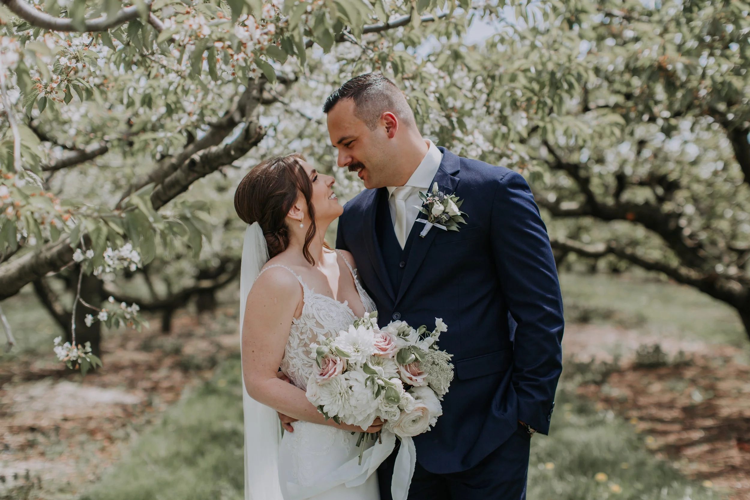 The wedding took place in the throes of cherry blossoms at Cherry Ave Farms, a perfect Spring backdrop. Florals pulled from the surrounding colour palette by Full Bloom Florals. Decor from Boutiquel Linen Rentals and stationery done by the bride’s sister.